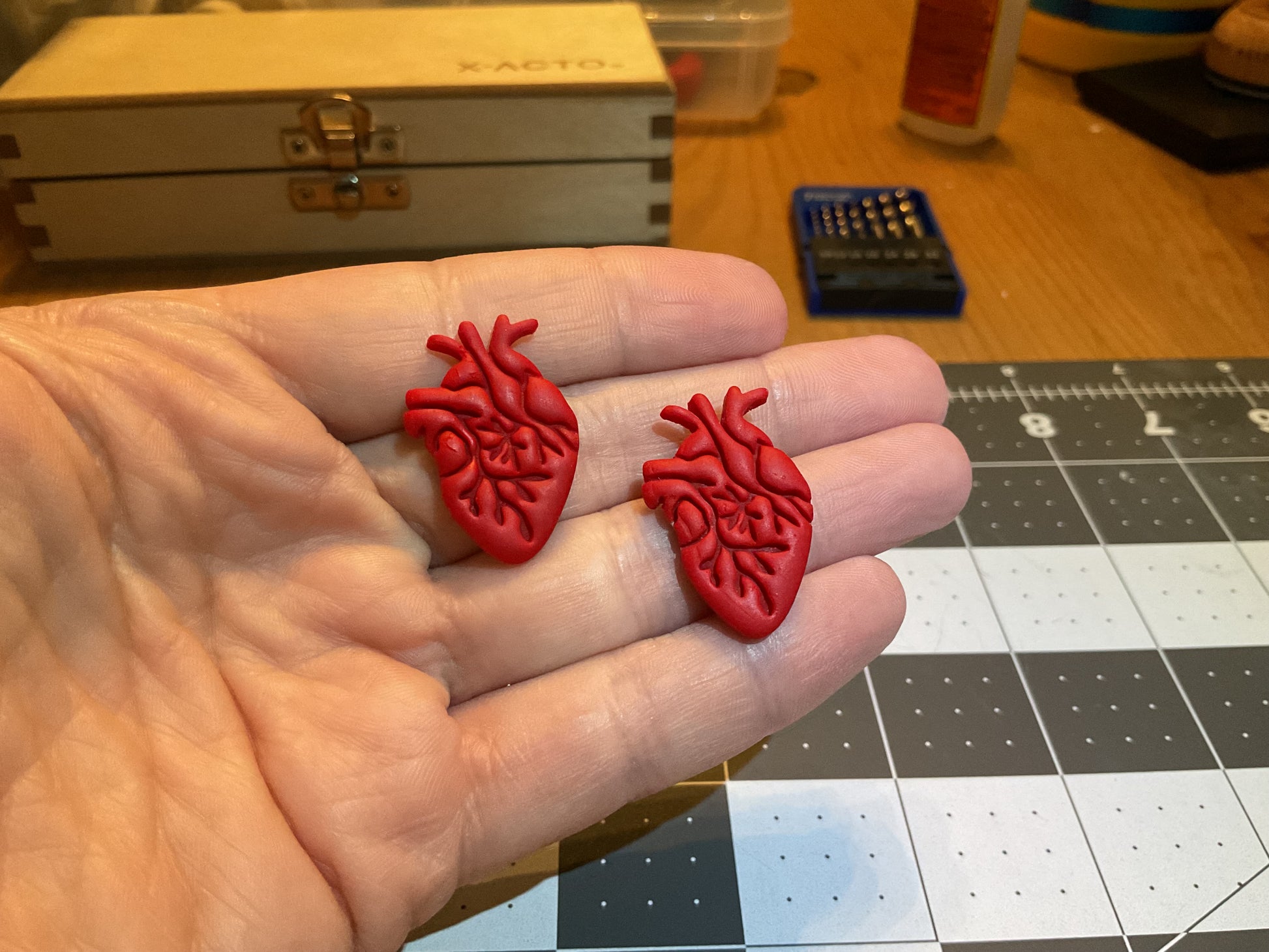 Handmade Anatomical Heart polymer clay earrings. Hardware options are 18K gold plated 30mm hoops, 14K gold fish hooks, or 14k gold plated studs.