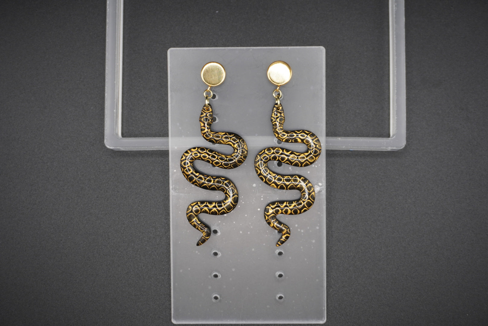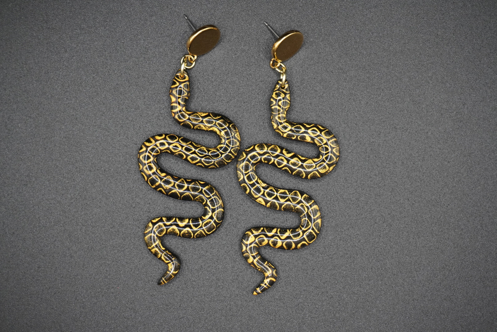 Elegant and enchanting, these golden-scaled black serpent earrings are perfect for any occasion. Set on flat gold-plated, hypoallergenic hardware, these beauties combine bold design with timeless charm—sure to become your new favorite pair.
