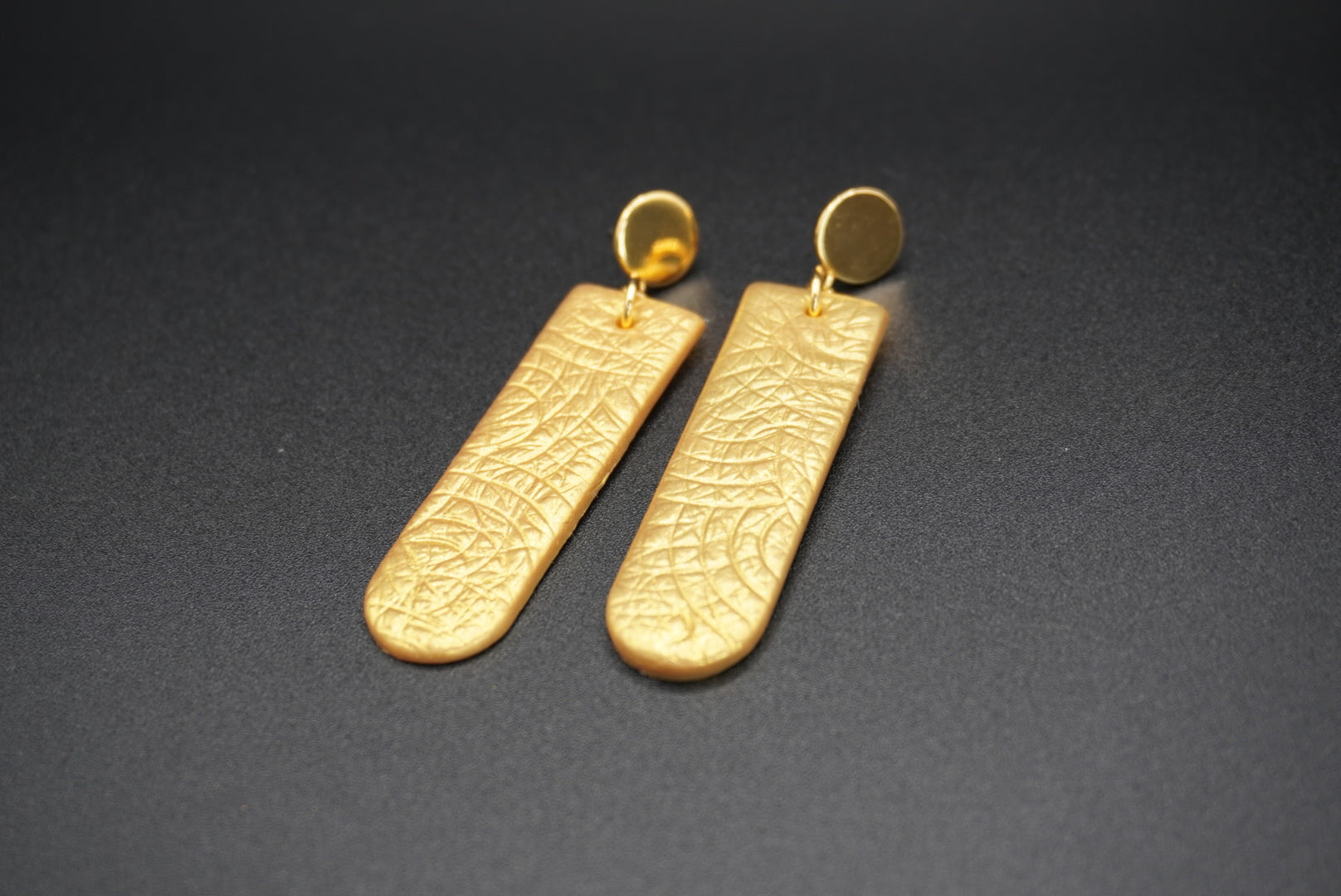 Bright gold faux weather leather strap with gold plated modern circle hardware. Lightweight and perfect for sensitive ears!