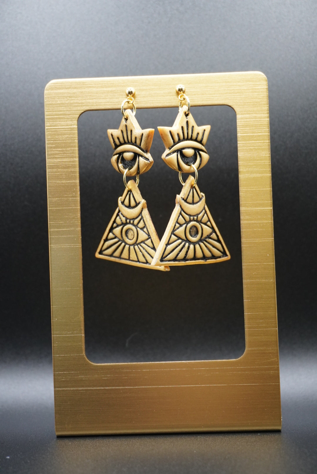Black and gold polymer clay Illuminati eye earrings with 24K gold plated hardware.