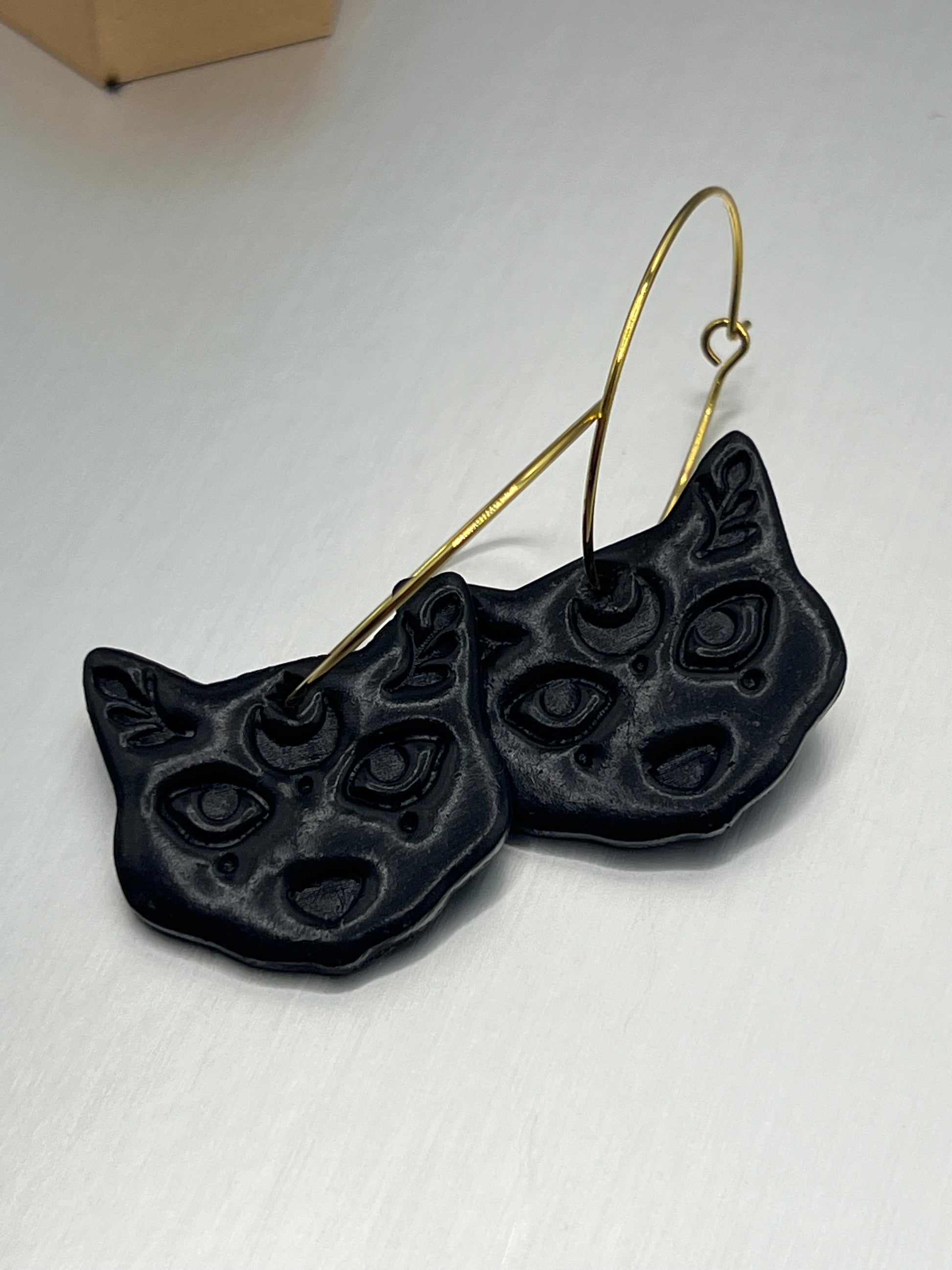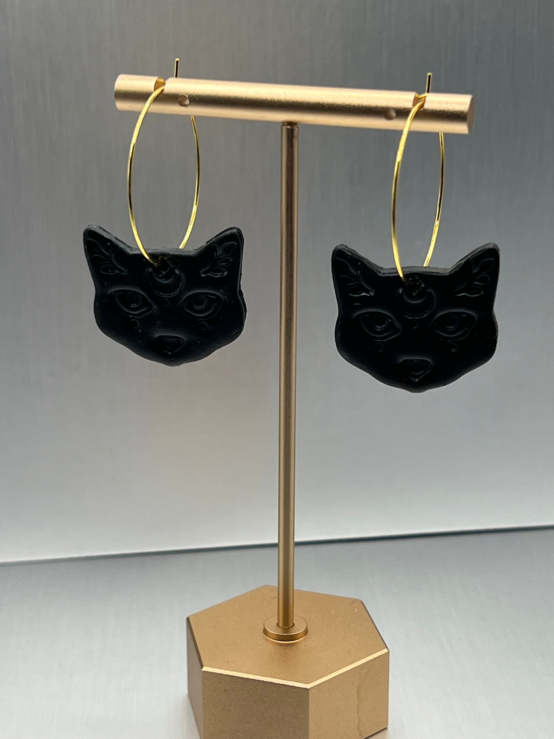 Handmade Moon cats with polymer clay earrings. Hardware is 18K gold plated 30mm hoops.